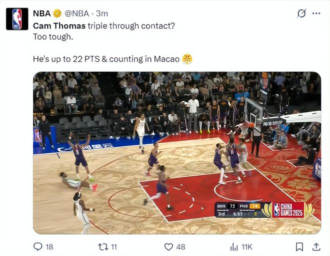 北京时间10月10日,NBA中国赛,篮网VS太阳,这场比赛是中国球员曾凡博的篮网首秀,但主角却是卡姆-托马斯,小火车这场比赛开场一波6中6连拿14分引来惊呼连连,三节打卡22分6助攻3篮板十分出彩。