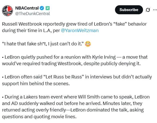 10月21日,美国Yaron Weitzman更新一篇长文,详细报道了威少在湖人的遭遇,同时透露威少讨厌詹姆斯的各种原因!