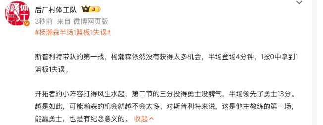 开拓者的小阵容打得风生水起,第二节的三分投得勇士没脾气,半场领先了勇士13分。越是如此,可能瀚森的机会就越不会太多。对斯普利特来说,这是他主教练的第一场,能赢勇士,也是有纪念意义的。