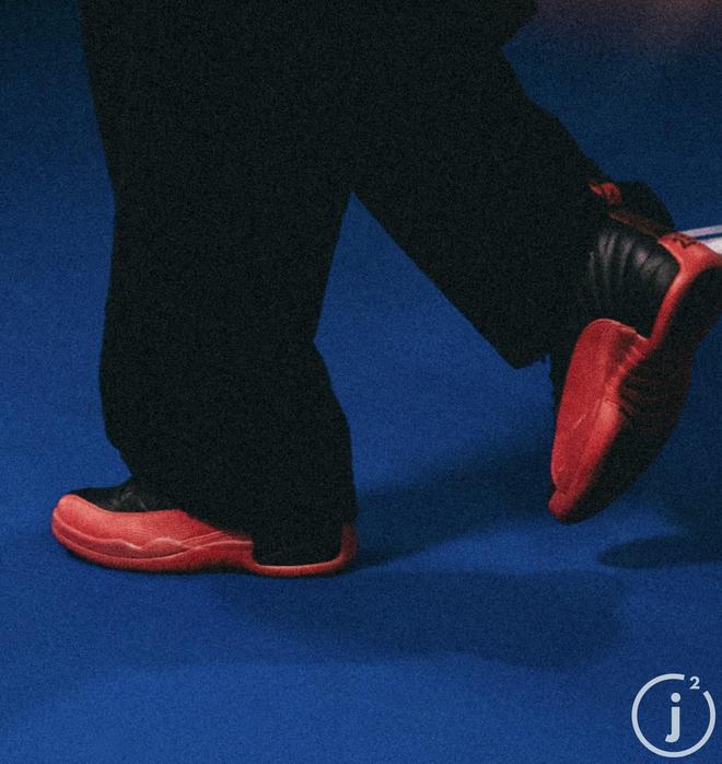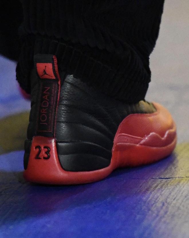 赛前,勇士球星斯蒂芬-库里上脚迈克尔-乔丹在1997年总决赛G5中“流感之战”配色的Air Jordan 12球鞋入场。